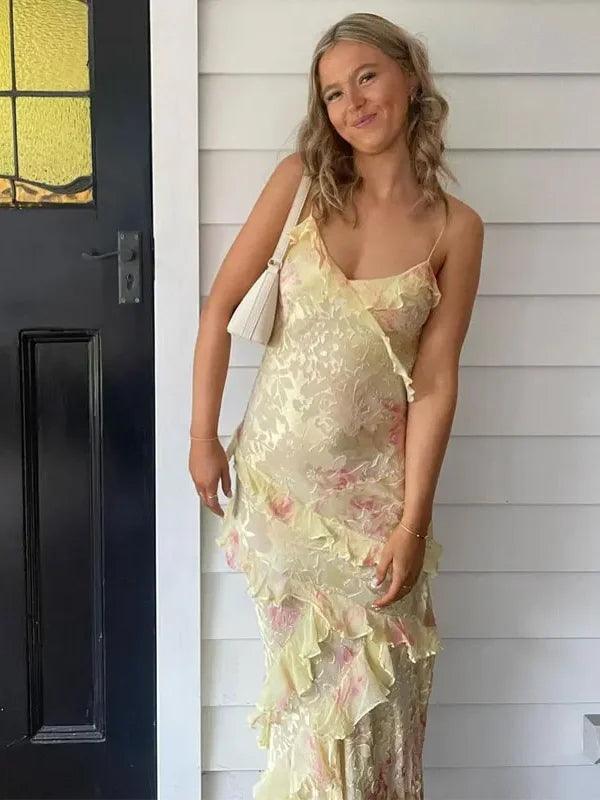 Tiered Ruffles Flower Print Maxi Dress Boho Chic Elegance