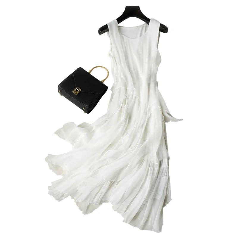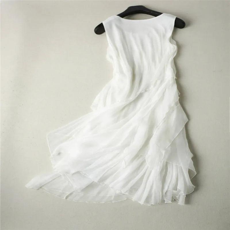 Introducing the Chic A-Line Sleeveless White Silk Dress for Women's Parties, a perfect blend of elegance and comfort. Crafted from luxurious silk, this stunning dress features a flattering A-line silhouette that complements every body type, making it an essential addition to your wardrobe.