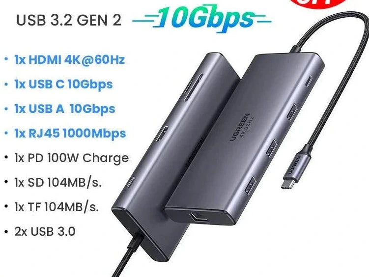 UGREEN 9 In 1 USB C Hub With 4K HDMI And Fast Charging extends your laptop or tablet with 4K@60Hz HDMI, 1000Mbps Ethernet, PD100W fast charging, a 104MB/s SD/TF card reader, and four USB ports in a sleek, durable housing. Perfect for MacBook, iPad, Windows, Linux, and Android, boosting multitasking, streaming, and file transfer without limits.