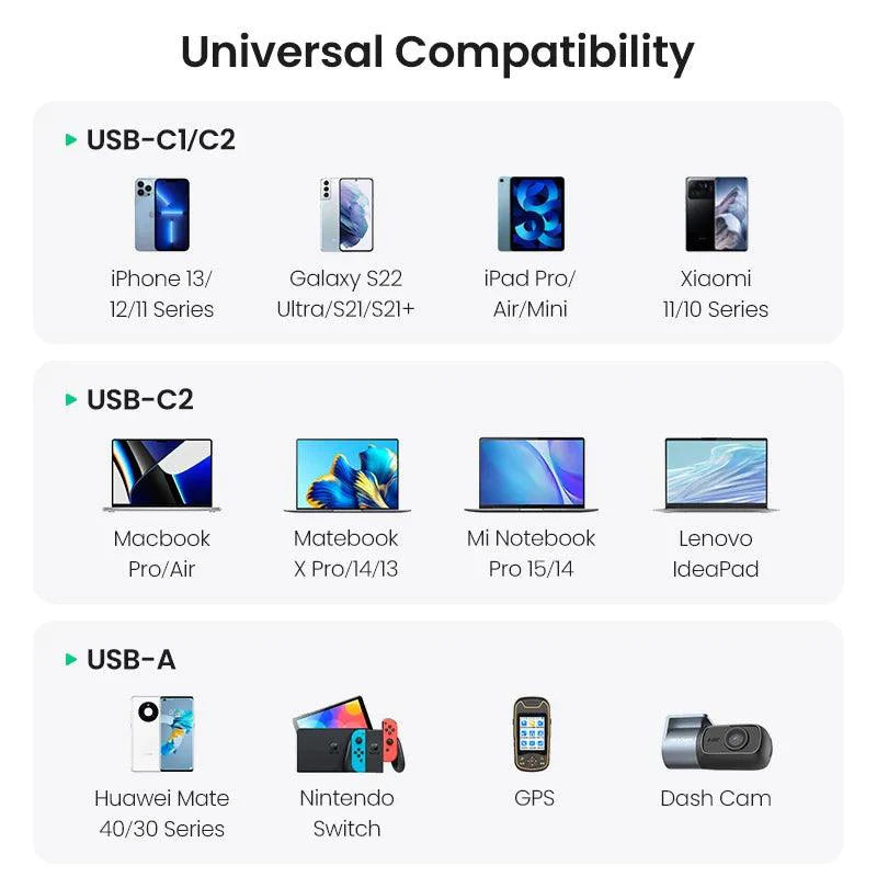 Transform your travel charging routine with the UGREEN 130W Fast Charging USB C Car Charger for iPhone. Whether you're on a long journey or a quick trip, this versatile charger is compatible with MacBooks, iPhones, Samsung Galaxy devices, and a host of other USB-C gadgets.