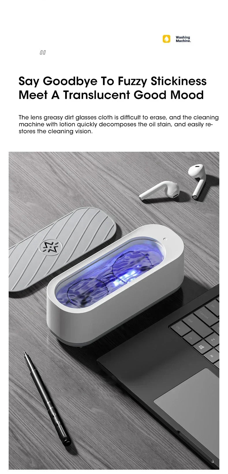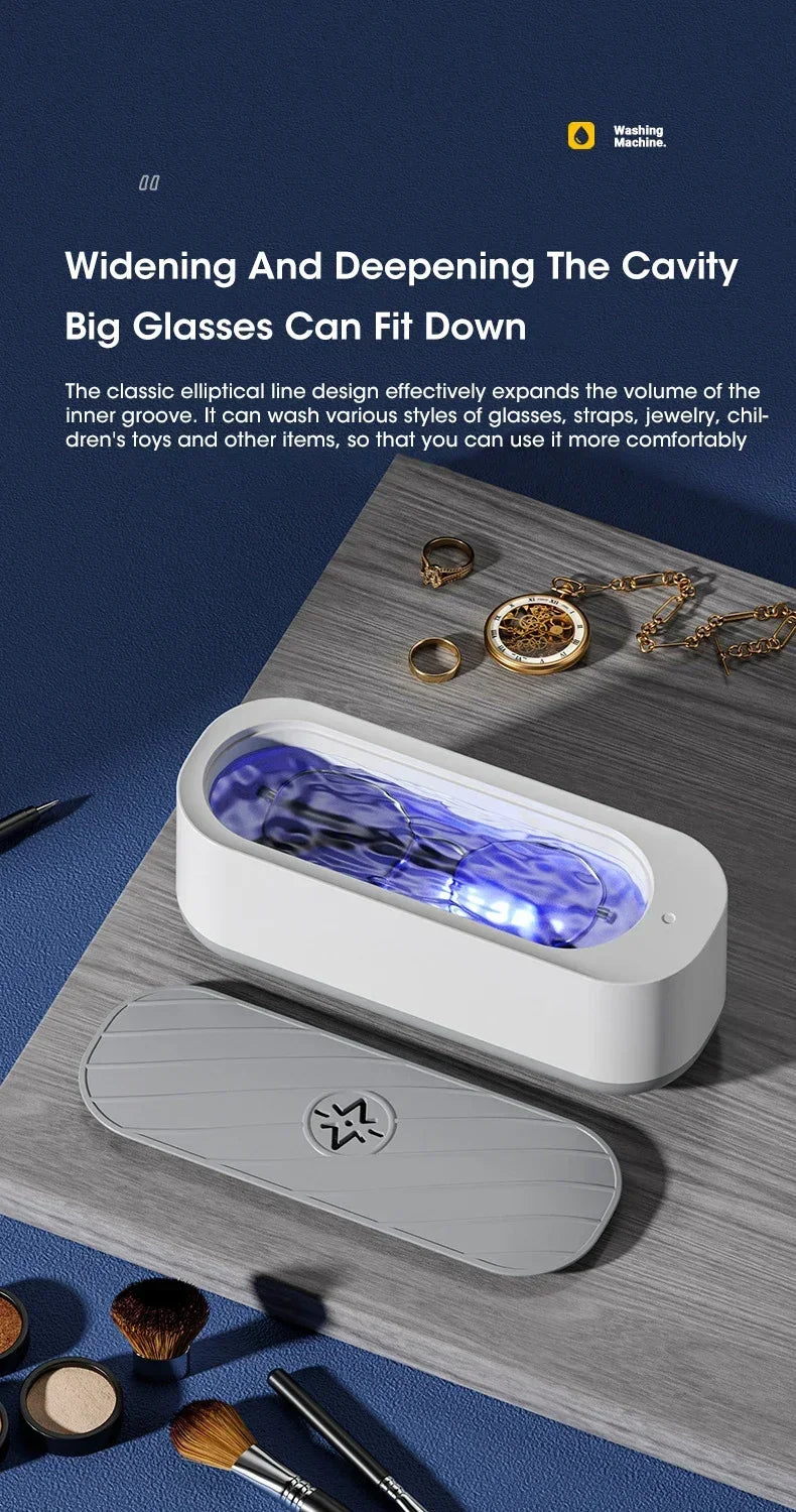 Ultrasonic Glasses And Jewelry Cleaner Machine Pro Edition delivers fast, safe cleaning for glasses, jewelry, and small items using advanced ultrasonic waves and optional UV sterilization. Compact, easy to use, and rechargeable, it removes dirt, grease, and grime from intricate designs with precision.