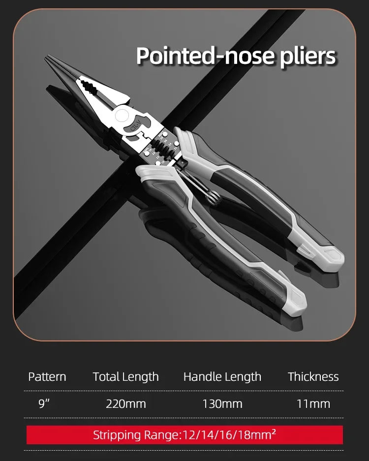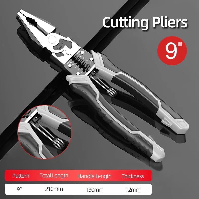 Universal Wire Cutter Diagonal Pliers Multifunctional Tools empower electricians and DIYers with cutting, crimping, and wire stripping in one compact tool. The non-slip silica gel handle reduces fatigue, while the precise crimping groove ensures reliable connections. At 9 inches, it's ideal for tight spaces and everyday electrical work.