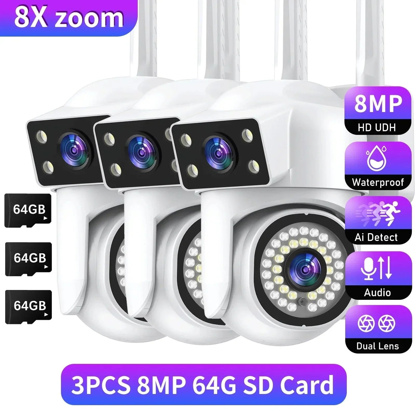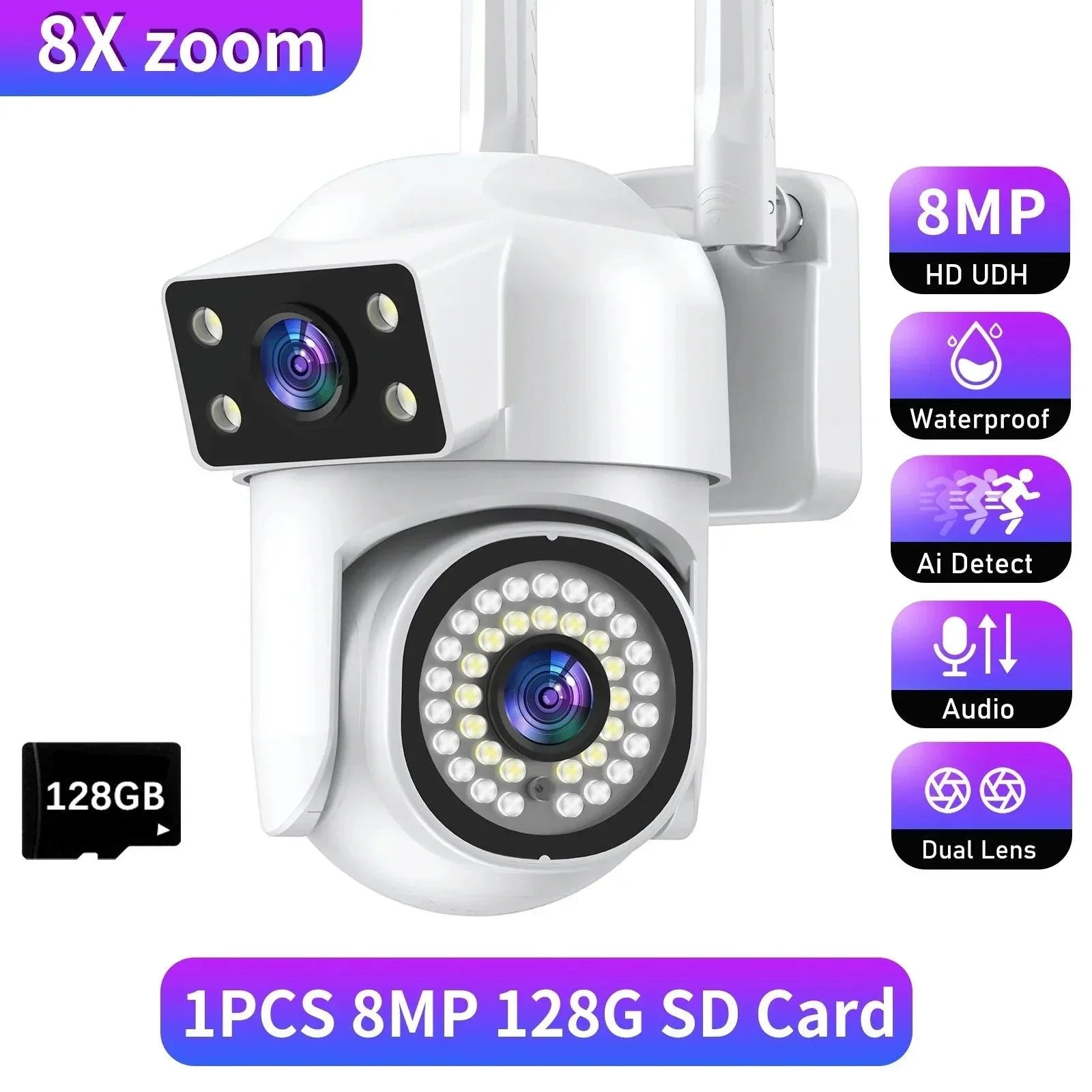 The Ultimate Outdoor Security Camera Enhanced Surveillance combines a Dual Lens Design (3.6mm and 8mm) for broad context and close-ups with an 8x digital zoom for crucial moments. Its IP66 weatherproof build, two-way audio, and both TF card and cloud storage ensure dependable, ready-to-review footage from any weather and location. This system is purpose-built for outdoor monitoring and peace of mind.