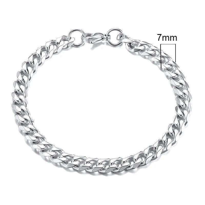 A: The Chunky Stainless Steel Curb Chain Bracelet For Men offers widths of 3mm, 5mm, 7mm, 9mm, and 11mm, with lengths 18cm, 21cm, and 23cm. For a snug fit, select the length closest to your wrist measurement; for a more relaxed feel, add about 0.5–1.5 cm.