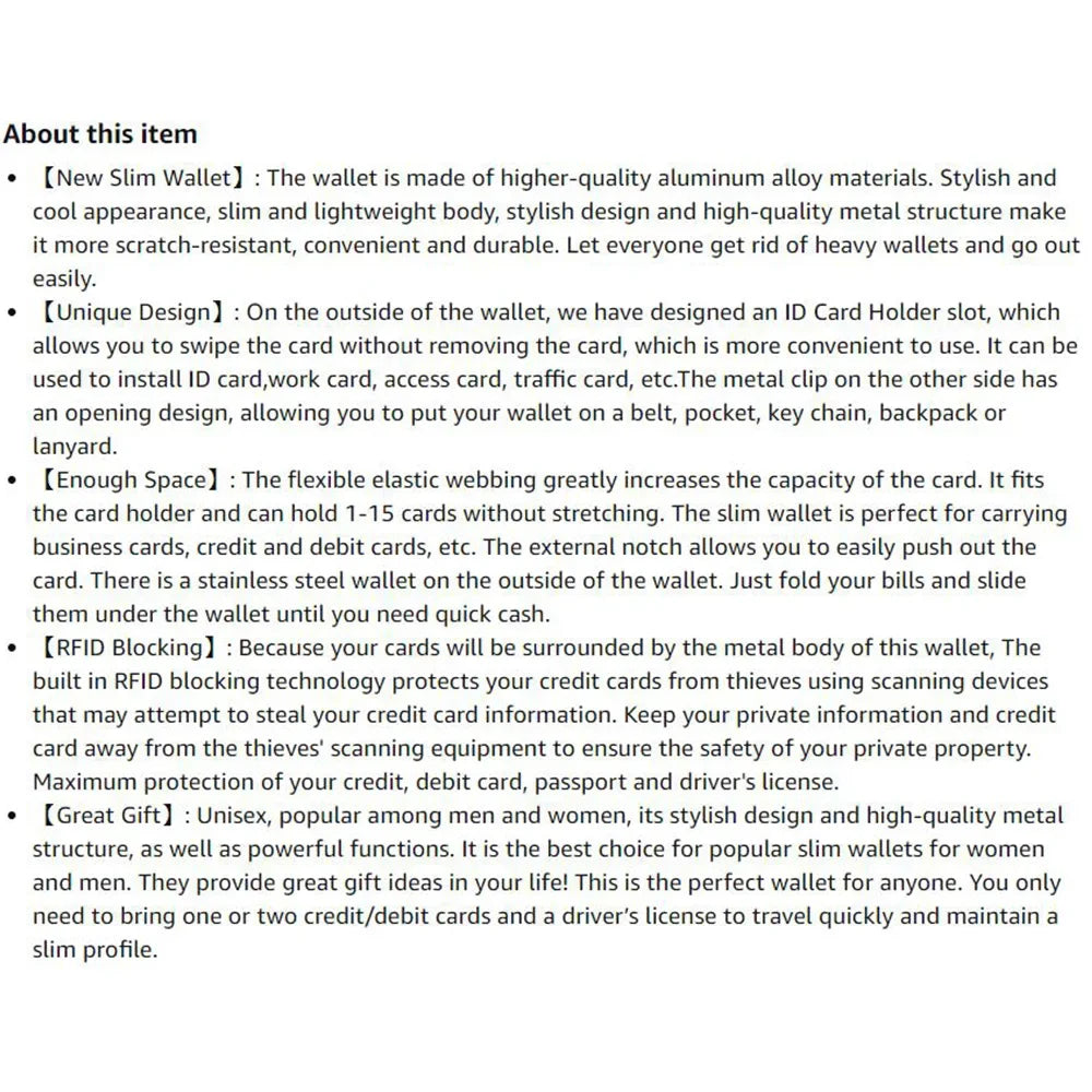 Our Wallet for Men Slim Aluminum Metal Money Clip RFID Blocking is not just a wallet; it's a lifestyle choice for those who appreciate quality and security. Experience the difference today!