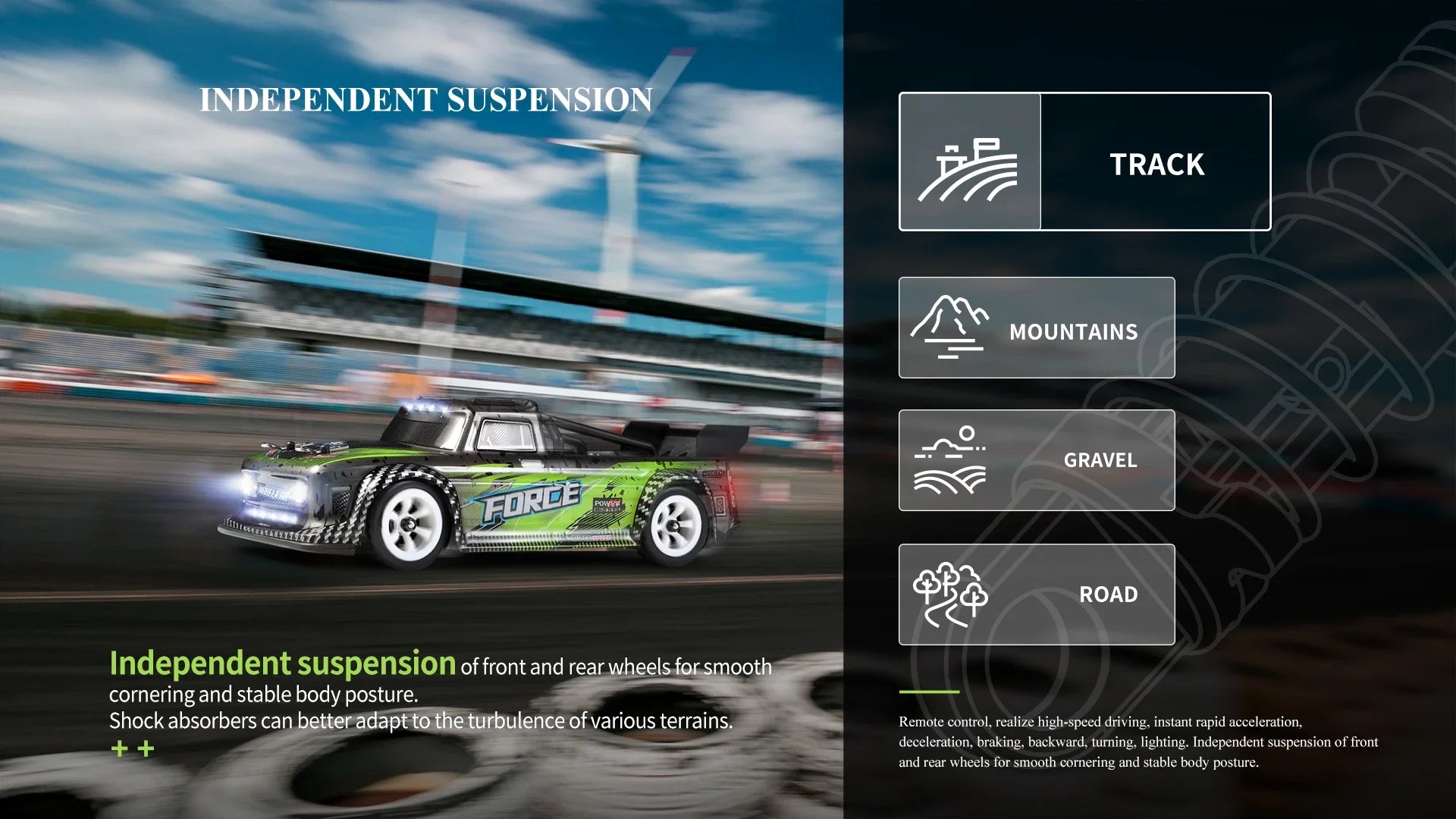 • Realistic Drift Experience: Experience sharp turns and thrilling drifts with the precise shock absorption system.