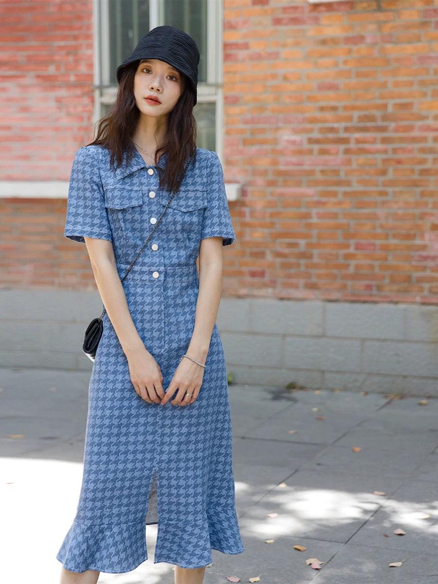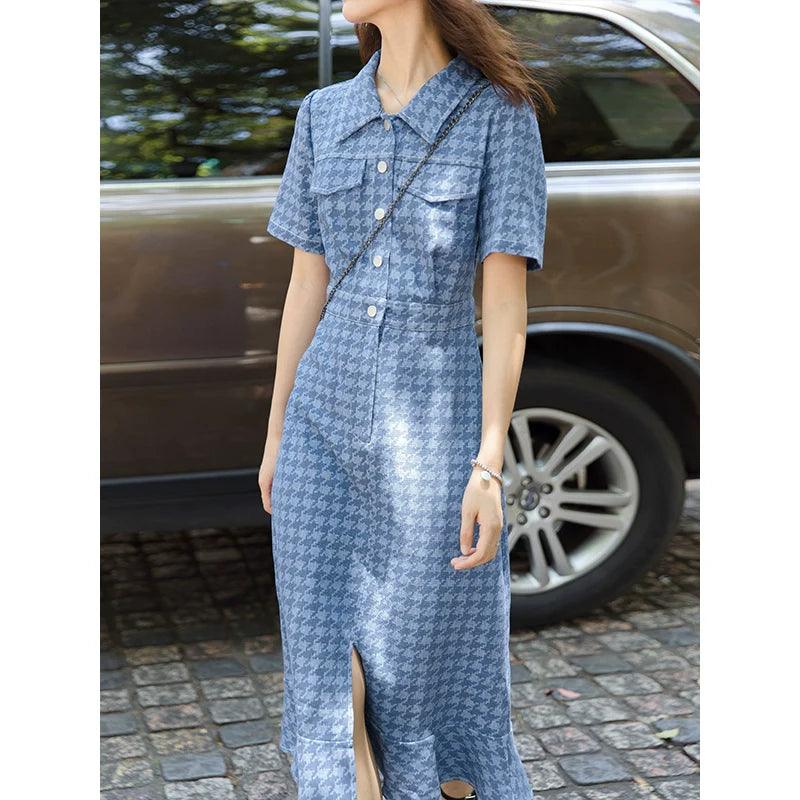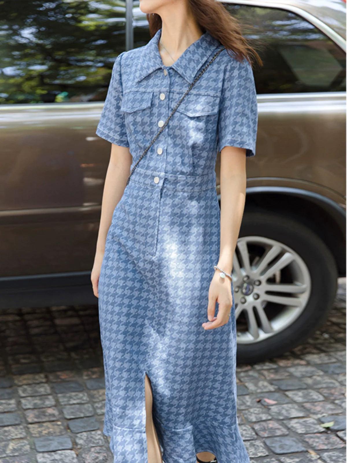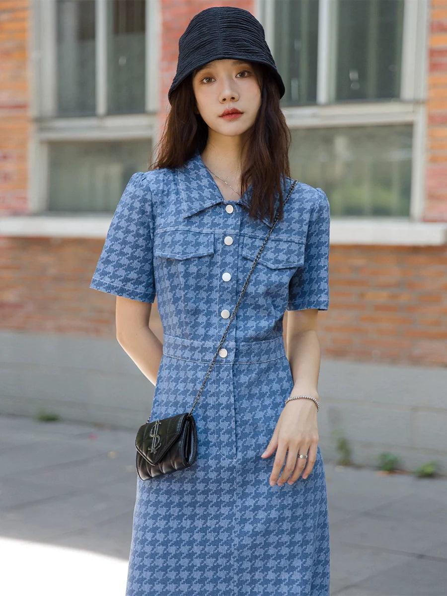 This Korean Style Chic Dress embodies the timeless appeal of retro houndstooth patterns while utilizing contemporary denim fabric. The high waist and short sleeves create a chic finish, making it suitable for a myriad of occasions, from casual outings to dressy events.