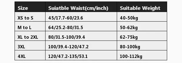 • XL to 2XL: Waist 80cm-100cm, Weight 62-75kg