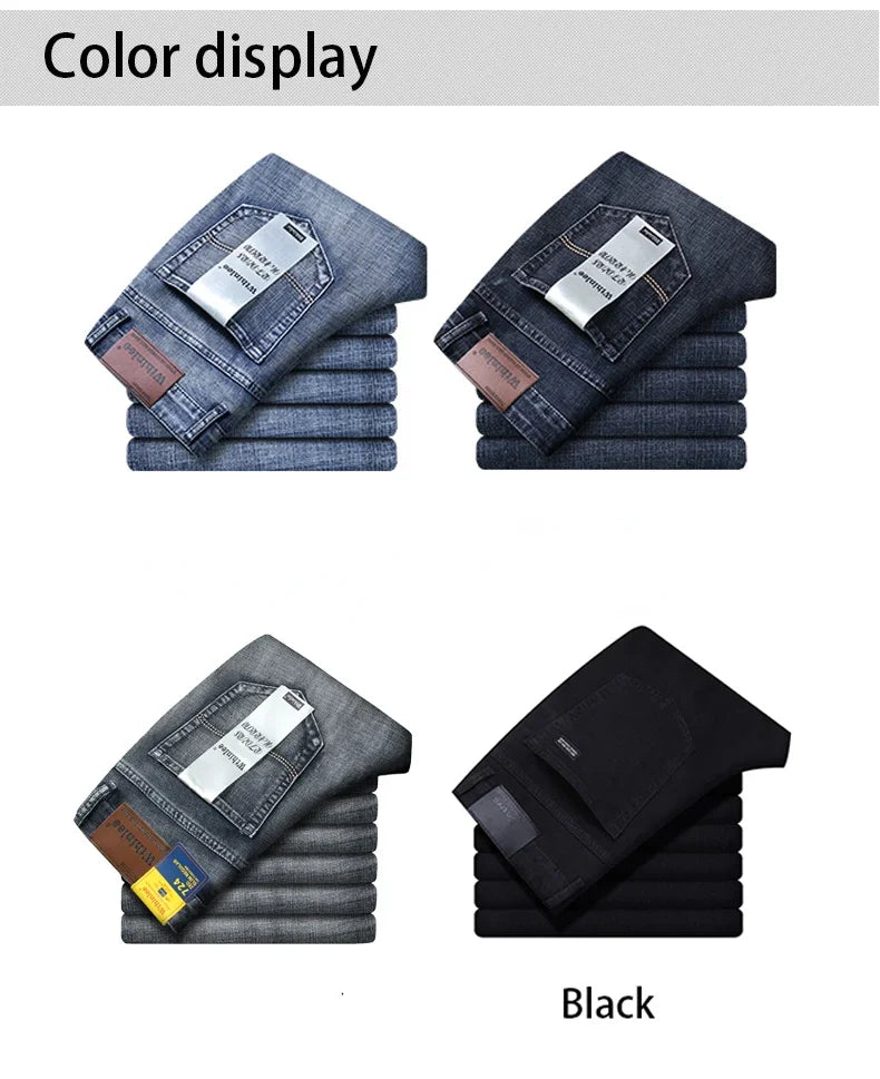 Check out our other offerings: 1. Straight Stretch Classic Blue Black Men's Jeans, 2. Comfort, 3. Durable Construction, 4. Versatile Style, 5. Seasonless Fashion, 6. Minimal Elasticity, 7. Easy Care, 8. Flattering Silhouette, 9. Quality Denim, 10. Year-Round Essential.