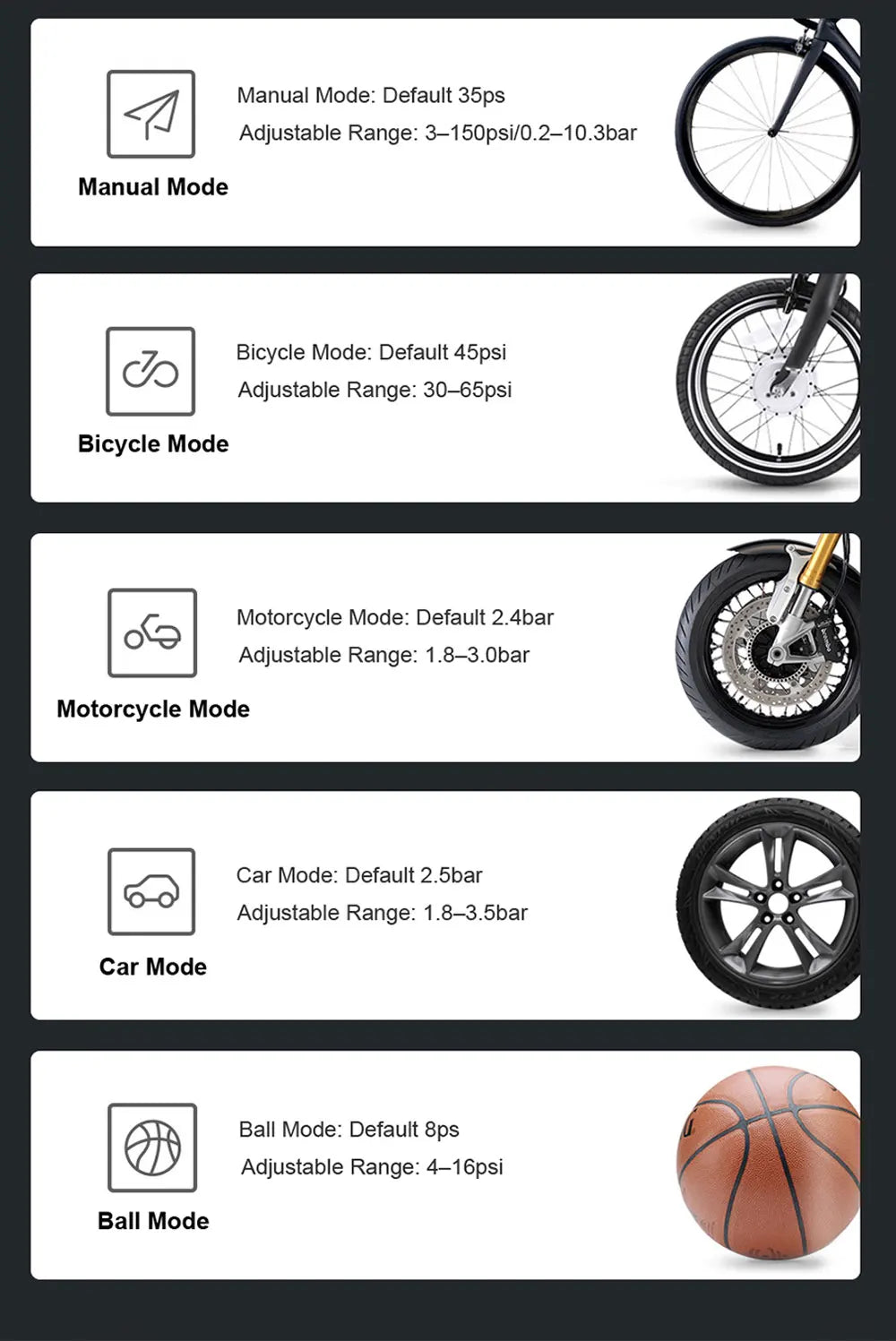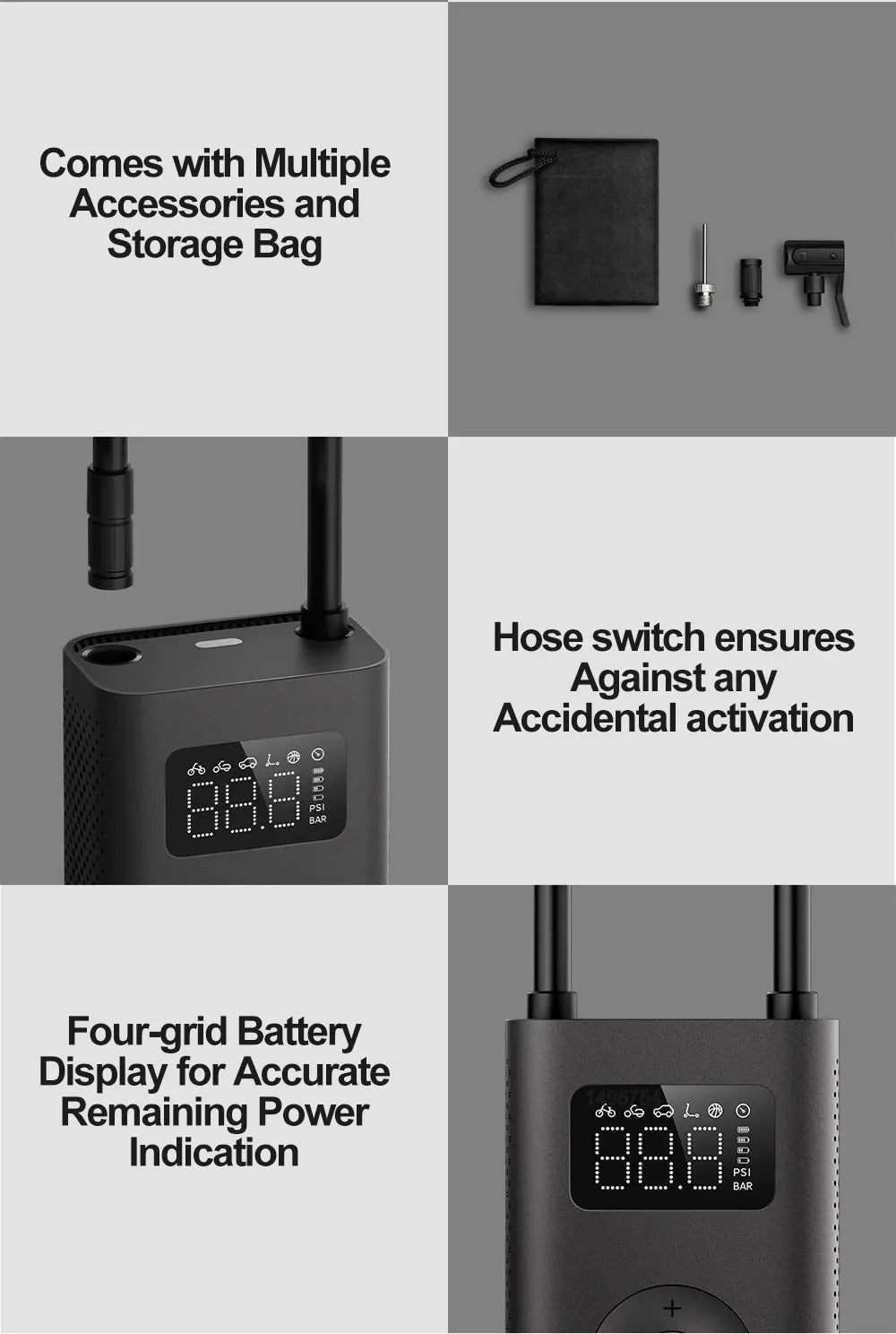 • Smart Pre-set Pressure: Automatically stops when your desired pressure is reached, ensuring precise inflation without worries of over-inflation.