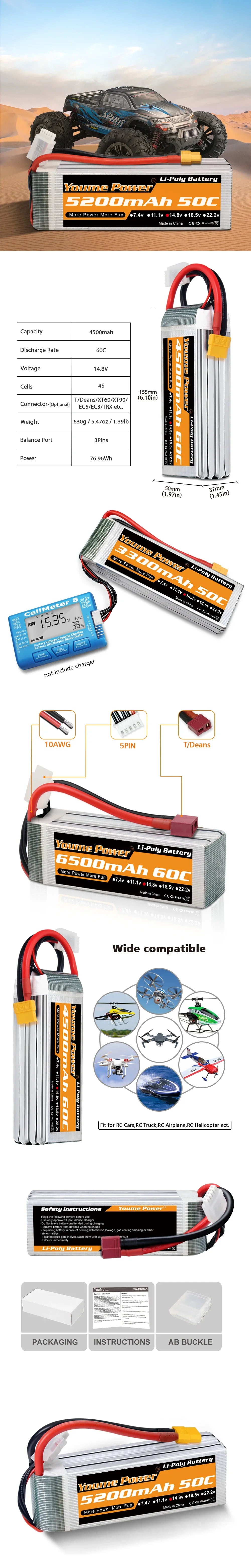 Safety is paramount when using the Youme 2PCS 14.8V 4S Lipo Battery Hardcase RC Parts 3300mah 6500mah. Always handle responsibly: avoid overcharging beyond 4.2V and discharging below 3.7V. Store in a secure environment and use a reputable balance charger.