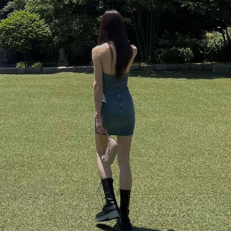 Spring Denim Backless Halter Dress for Young Adults